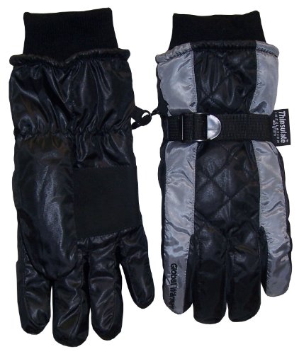 Global Warmers TM by N'Ice Caps boys shiny quilted taslon Thinsulate and waterproof glove with soft sherpa lining. Very soft and comfortable, has knit cuff, sure grip palm, adjustable web strap on wrist, elastic under wrist. Color: black/charcoal grey. 4 sizes. One size fits 2-4yrs (3.75" across palm, 5.5" from elastic to end of middle finger.) One size fits 4-7yrs (4" across palm, 6" from elastic to end of middle finger.) One size fits 8-12yrs (4.25" across palm, 7.25" from elastic to end of middle finger.) One size fits 13-15yrs (4.5" across palm, 7.5" from elastic to end of middle finger.) Tested and approved as per CPSIA standards.