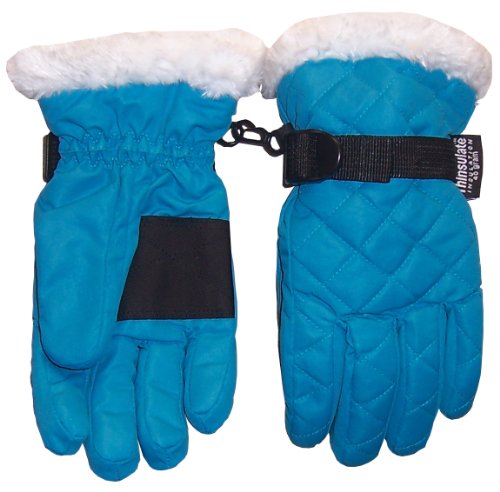 N'Ice Caps TM girls Thinsulate and waterproof quilted ski glove with faux fur trim. Has sure grip curved palm, curved fingers, adjustable web strap on wrist, elastic under wrist. Shell: quilted taslon. Inner lining: Thinsulate and waterproof. Outer lining: poly fleece. Color: turq/white. Available in 2 sizes. 8-12yrs one size (4.25" across palm, 6.5" from elastic to end of middle finger.) 4-7yrs one size (4" across palm, 6" from elastic to end of middle finger.) This product has been tested and approved as per CPSIA standards.
