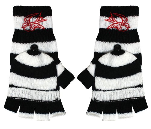 These fingerless gloves have a foldover mitten flap to keep your fingers warm. The gloves are black and white striped with a red embroidered sparrow on the cuff and a small skull on the back side.